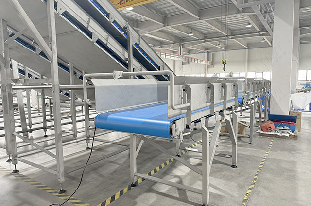 使用自動輸送帶將處理好的蔬菜送入包裝環(huán)節(jié)。