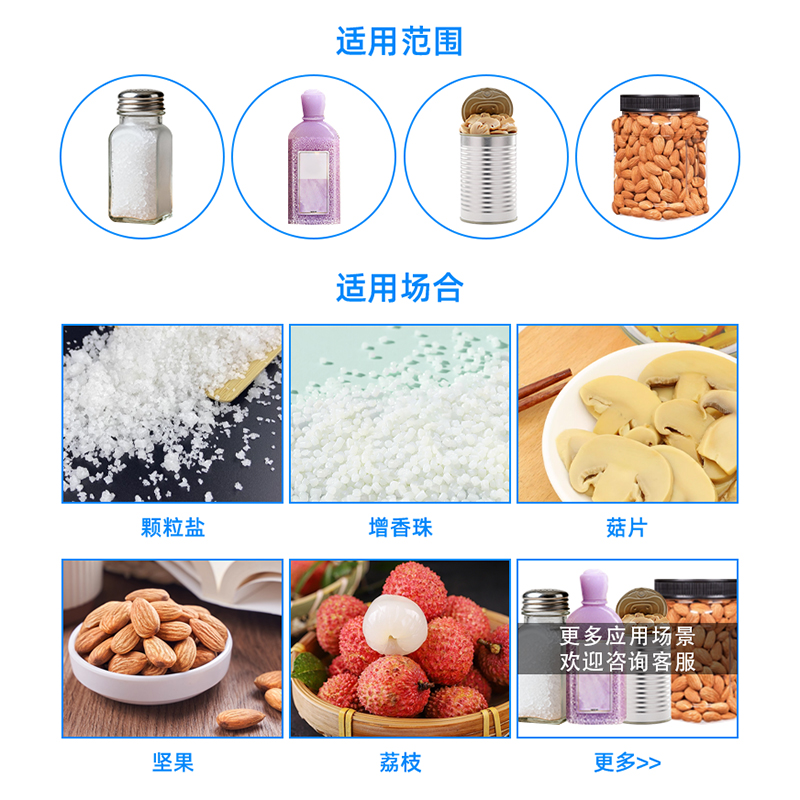 該設備適用于不規則的塊狀和顆粒狀物料的計量包裝,如各類水果、糖果、膨化食品、小餅干、炒貨干果、砂糖、速凍食品等。