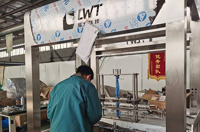 這臺目前正在組裝中的設(shè)備是我們的活塞灌裝機,該灌裝機將被用來灌裝番茄醬。設(shè)備采用304不銹鋼,不僅保證了設(shè)備外觀干凈美觀,也方便設(shè)備清洗和保養(yǎng)。