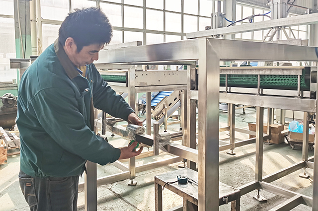 這臺已經(jīng)組裝完成的設(shè)備是卸籠機。卸籠機主要用于各種肉罐頭、蔬菜罐頭及二次滅菌的塑膠瓶飲料等在殺菌后的卸籠工作。